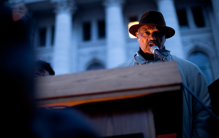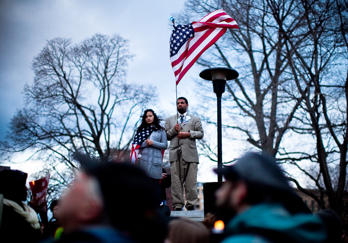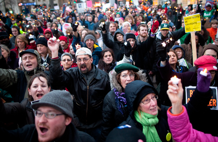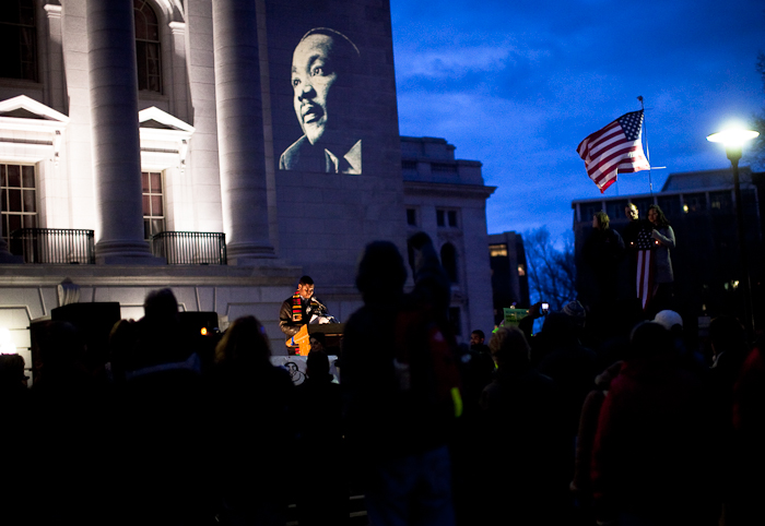 Besides the photo aspects of this rally-turned-candle-light-vigil, I thought the politics behind it were somewhat inappropriate. Today is the anniversary of Martin Luther King Jr.’s death…however, tomorrow is election day for Wisconsin — I’m sure you can see how this panned out. While it’s great to commemorate the courageous life of King, I don’t think using his death to shove more election signs, stickers and pins in peoples’ faces is the right way to remember the life of a great individual. And neither are the speaker-led chants of, “Be alive on April five!” Why turn this into a political event? Why try to draw comparisons to worker’s struggles in Madison to the struggles during the Civil Rights Movement? They’re not even close — and to suggest they are is ridiculous.