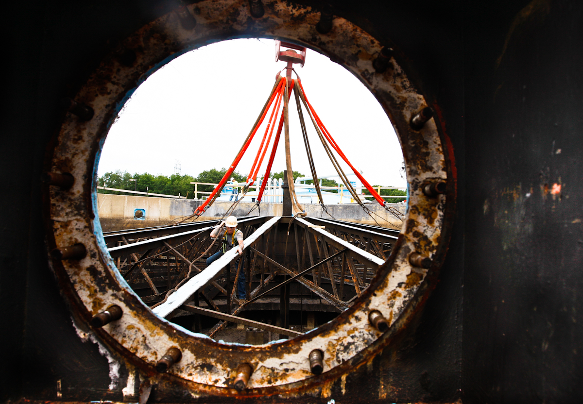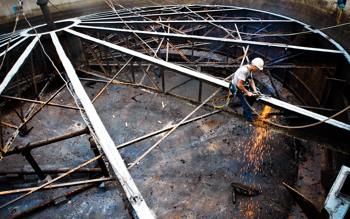 So when I got sent on a mystery assignment (meaning I had to find something cool to take a photo of there) to the water treatment plant on the south side of Janesville, I was pretty pumped to find a guy welding. Specifically though, he was burning holes in steel to lift an old container off a giant septic tank at the treatment plant. Eww. The smell was awful and this guy was just crawling around on the steel beams that had old poop sludge hanging all over it. What really put it over the top was he wasn’t even wearing gloves.