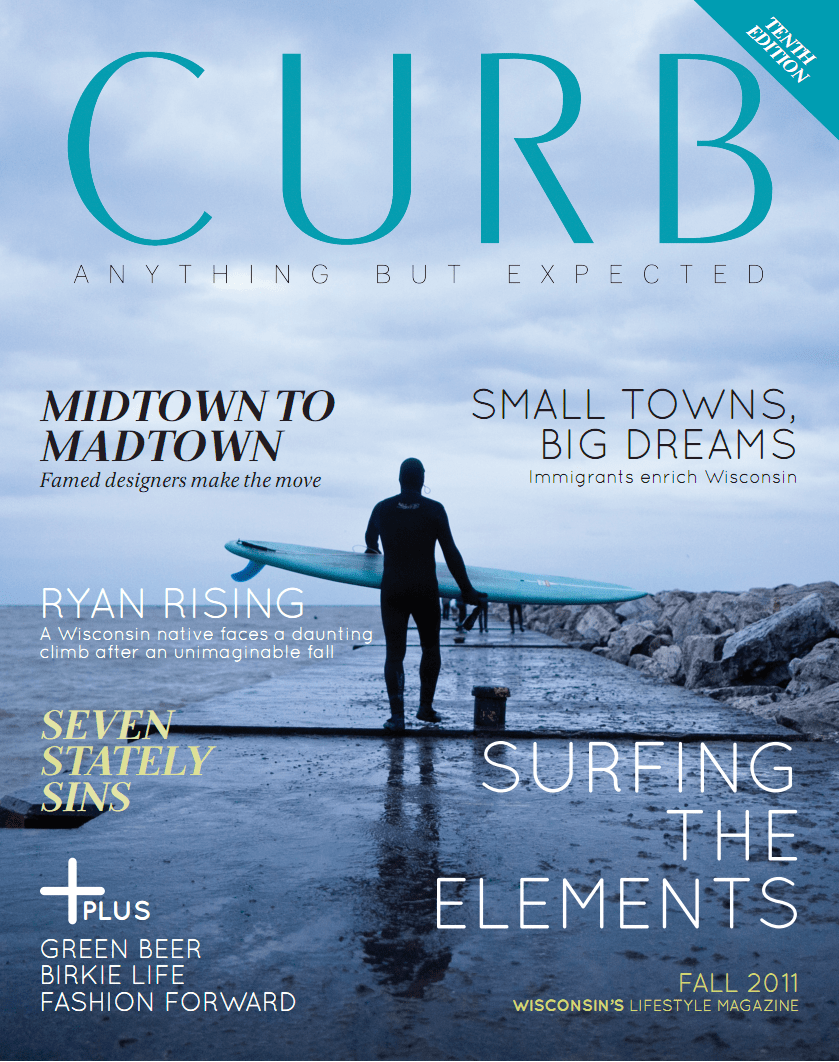 The day of the cover shoot for Curb Magazine, Sheboygan weather was the antithesis of Malibu. Cold, 45mph winds gusted off of Lake Michigan and the water temperature sat just around 40 degrees. The sky was a cloudy bluish gray and sand-sized rain droplets pelted us for almost the entire 2 hours we were out there.