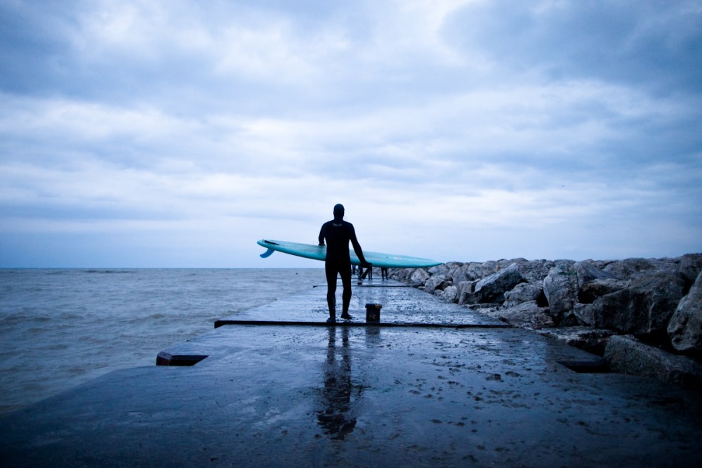 After I changed out of my wetsuit, we decided to take one last stroll along what is called “The Elbow” in Sheboygan. Basically it is the long pier leading out into one of the prime surfing spots on the shore. With the sun beginning to set, the colors in the sky turned a nice blue. Conveniently for me a surfer passed me with his (nearly) matching blue surfboard. I quickly shot a few off a few frames and followed him until I felt satisfied with what I’d gotten. At the time though, I thought of it as a throwaway shot that I might give to the magazine if they wanted some filler.