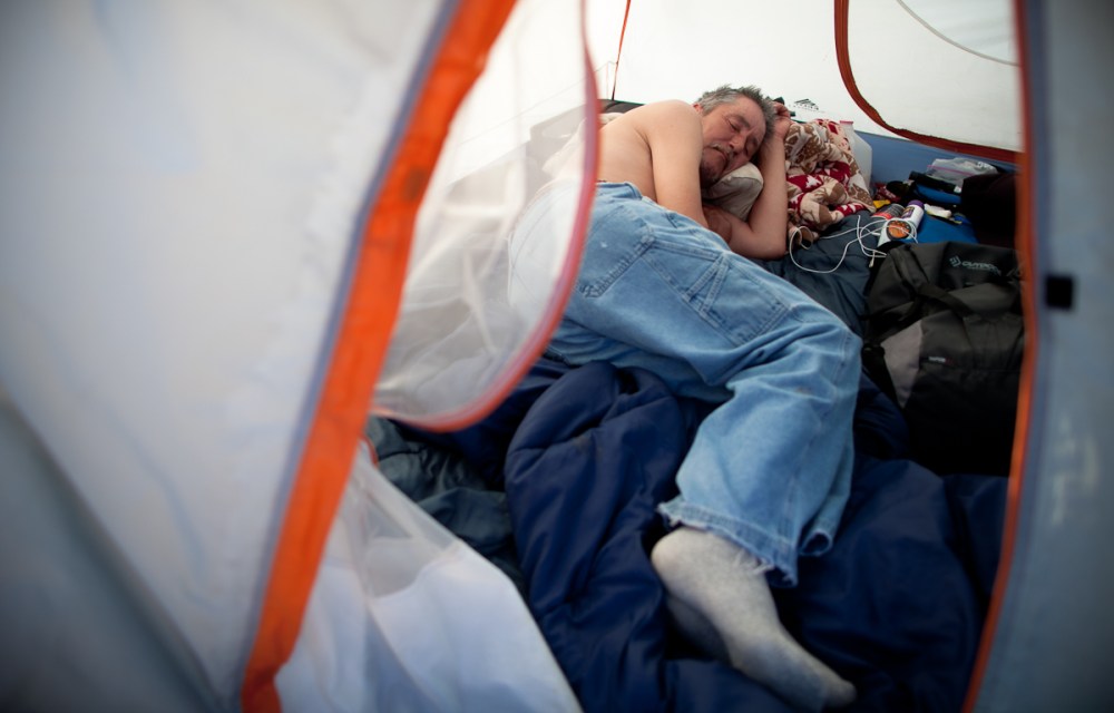 No one was more open than Dale, who I spent a number of hours with visiting him and talking about his involvement with the camp. I think my relationship and genuine interest in his life allowed me to get one of my favorite images of the photo essay, where he’s asleep in his tent after we grilled some brats (in other words, he slipped into a food coma). Before he laid down he gave me a small tour of his tent, much like anyone would give a tour of their new home. He was proud of what he had and wanted to make sure I documented it.