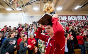 Luke Vanlanen carries the WIAA Division 2 State Basketball trophy through the Pulaski High School gymnasium on Sunday, March 10, 2013. Lukas Keapproth/Press Gazette Media