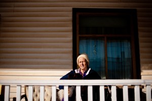 On a seasonably warm afternoon, Carol Montgomery sits on the porch of her home in Brooklyn, Minn., on Wednesday, February 27, 2013. Montgomery’s home sits just beyond the border of the Hibbing Taconite mine, where the proximity to the mine has colored the siding on her home in a light reddish brown dust. Lukas Keapproth/Press-Gazette