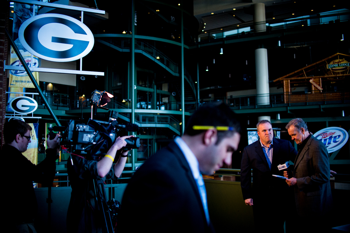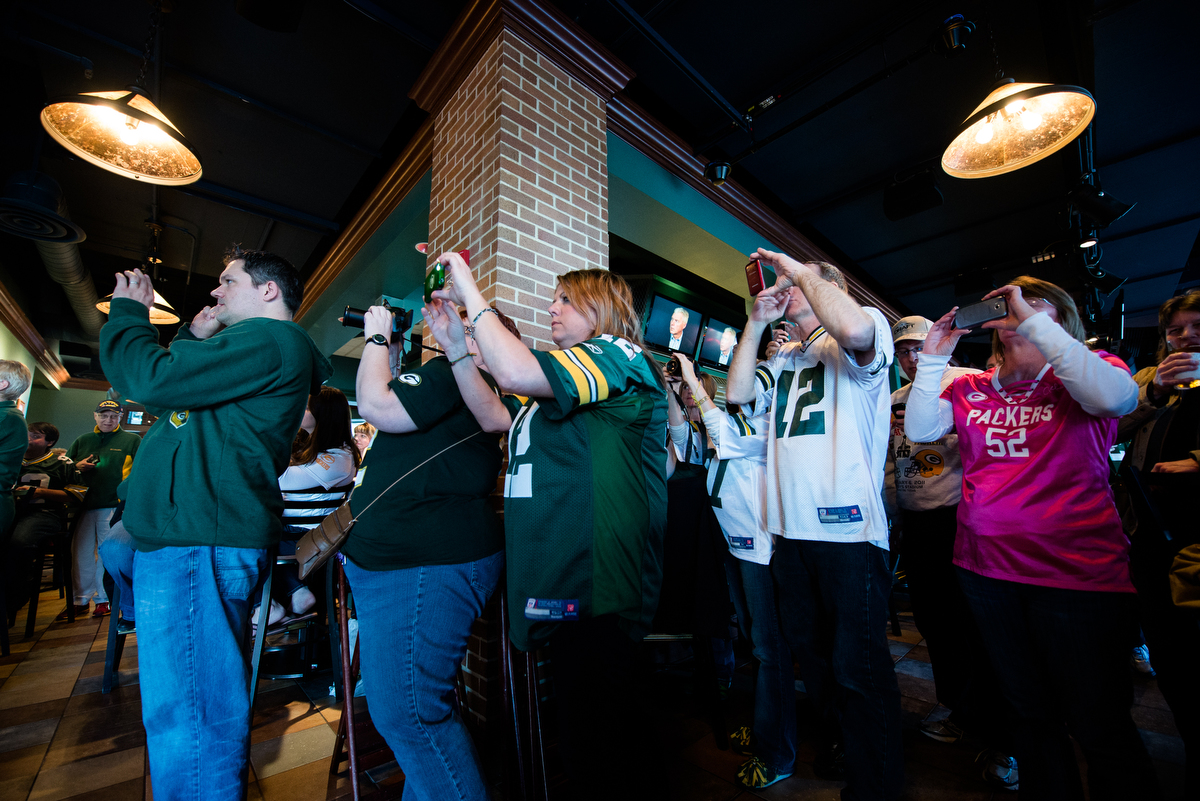 When I was assigned the NFL draft party at Lambeau, I got excited to get creative. Sometimes events where there are lots of people pumped about one particular thing can lead to some nice candid moments. But, as is often common, what I imagined the NFL draft party to be and what it was were entirely different things. First off, I thought there would be a line of people lining up to get inside (which sounds boring, but they would have been lining up at 6pm, when the light is nice. Anything is exciting when the light is nice). Also, there just weren’t that many people and they weren’t that excited. Boo.