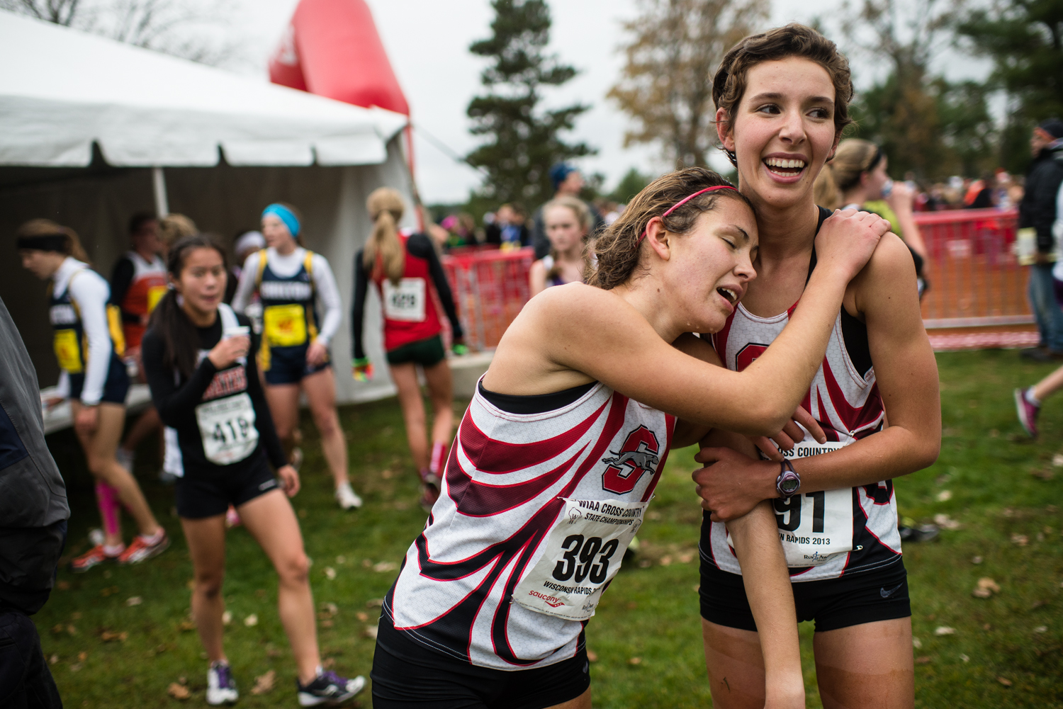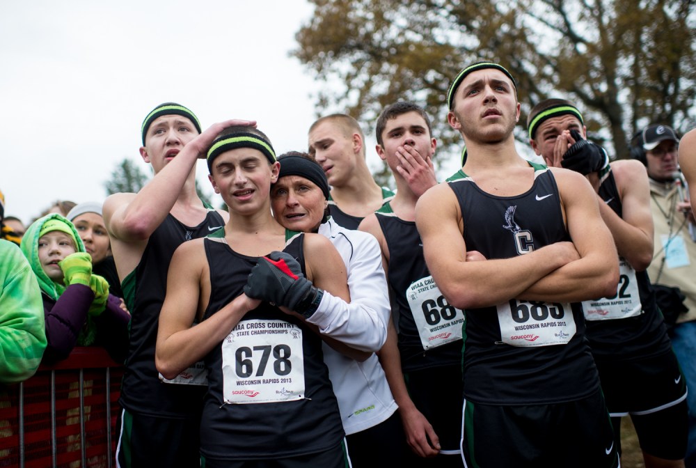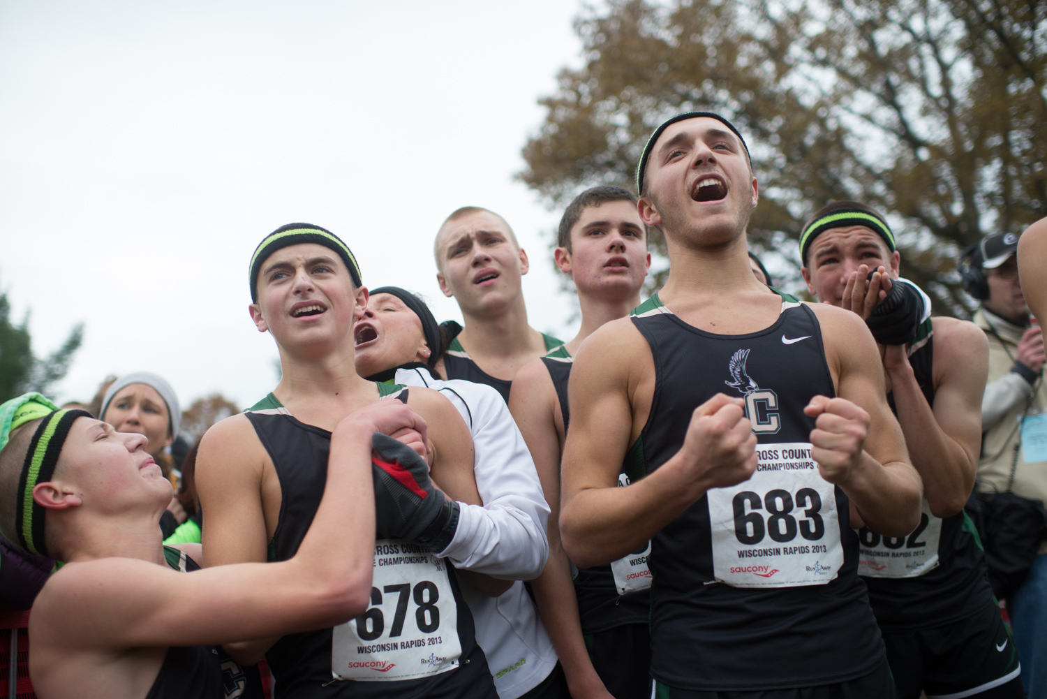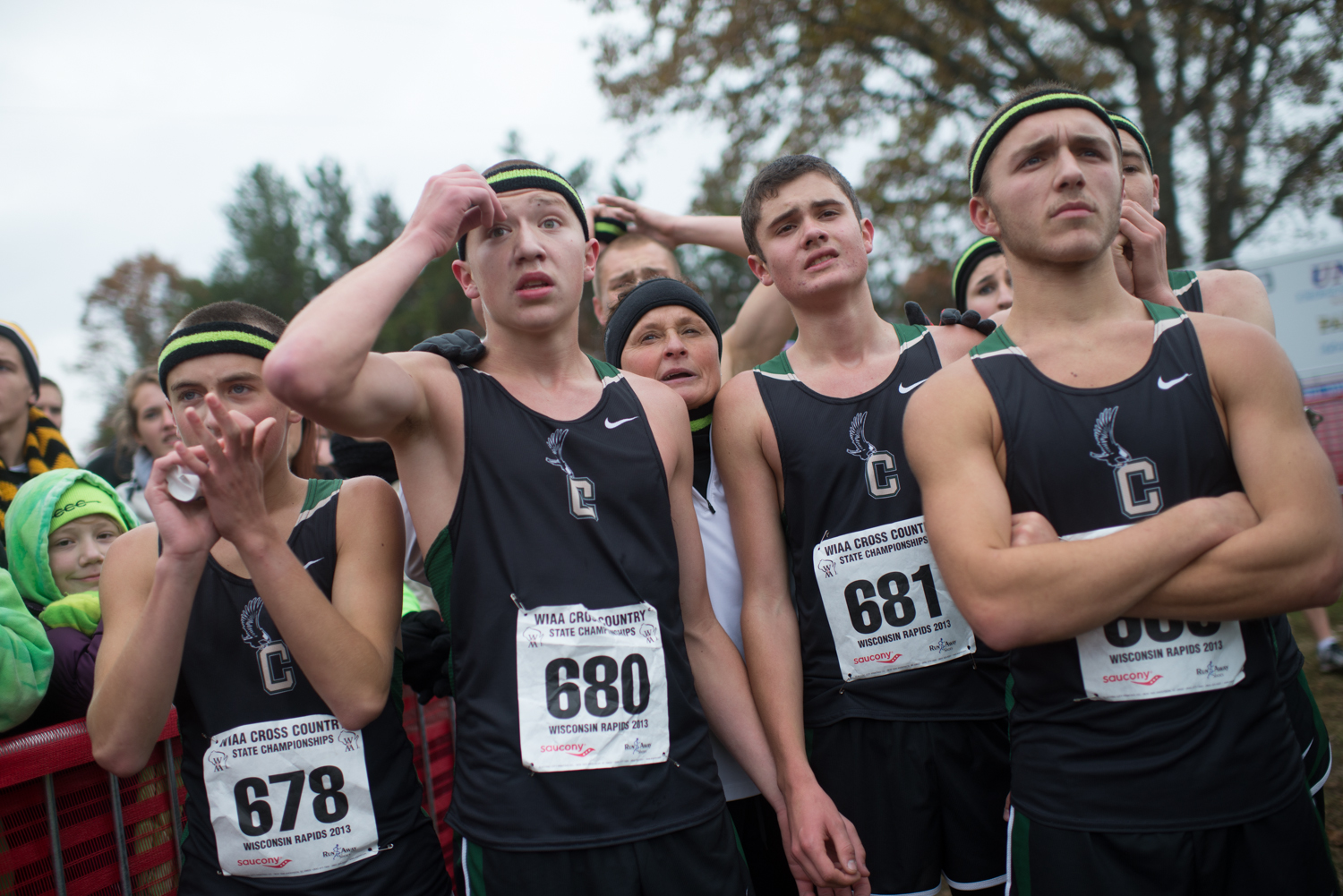 Shooting the girls after the finish line was much more rewarding than the boys. The boys more or less just walked through, waved to a couple people and then headed for the bus. Thankfully, there were a couple teams that didn’t, mainly the ones who thought they had a chance to clinch the title. In Division 3, Chequamegon thought they were that team. They first caught my eye because of their ridiculously enthusiastic coach who was kissing all of them before they gathered together to wait for the results. This is them as they waited.